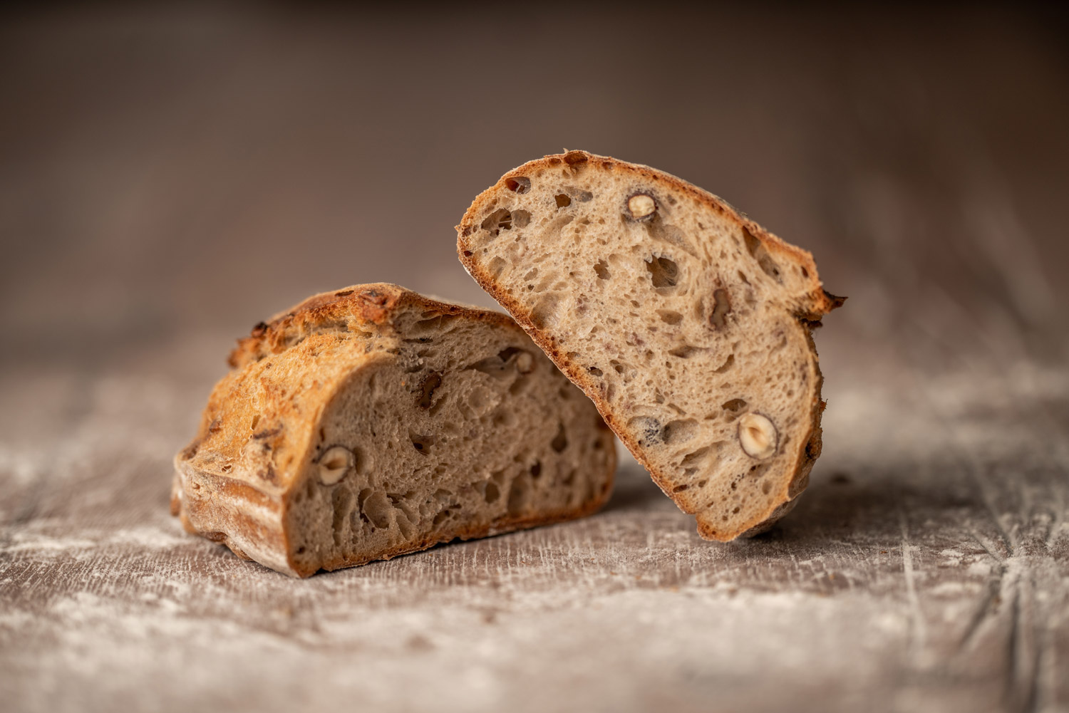Unser Nussbrot hat einige Versuche gebraucht bis es so wurde, wie es nun ist. Ein reines Weizenbrot, das mit sehr wenig Backhefe auskommt und mit frisch gerösteten Wal- und Haselnüssen veredelt wurde.
